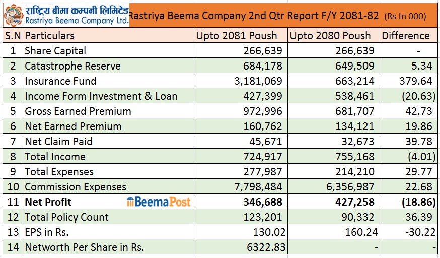 प्रकाशित वित्तीय विवरण अनुसार कम्पनीको खुद नाफा गत आवको दोस्रो त्रैमासको तुलनामा चालू आवको सोही अवधिमा १८ दशमलव ८६ प्रतिशतले घटेको छ। कम्पनीले गत आवमा ४२ करोड ७२ लाख रुपैयाँ नाफा कमाएकोमा चालू आवमा बढेर ३४ करोड ६६ लाख रुपैयाँमा सीमित भएको छ।
