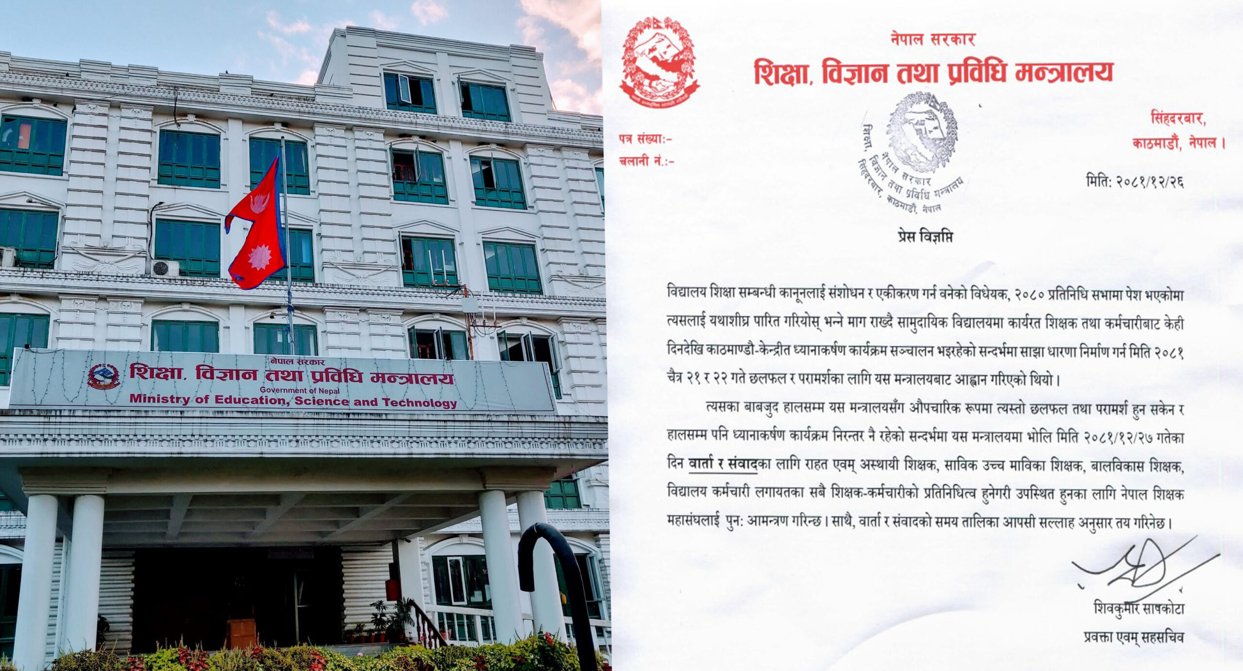 वार्ताको समय भने आपसी सल्लाहअनुसार तय गरिने विज्ञप्तिमा उल्लेख छ । विद्यालय शिक्षासम्बन्धी कानुनलाई संशोधन र एकीकरण गर्न बनेको विधेयक, २०८० यथाशीघ्र पारित गरियोस् भन्ने माग राख्दै नेपाल शिक्षक महासंघको आह्वानमा शिक्षकहरुको आन्दोलन जारी छ ।