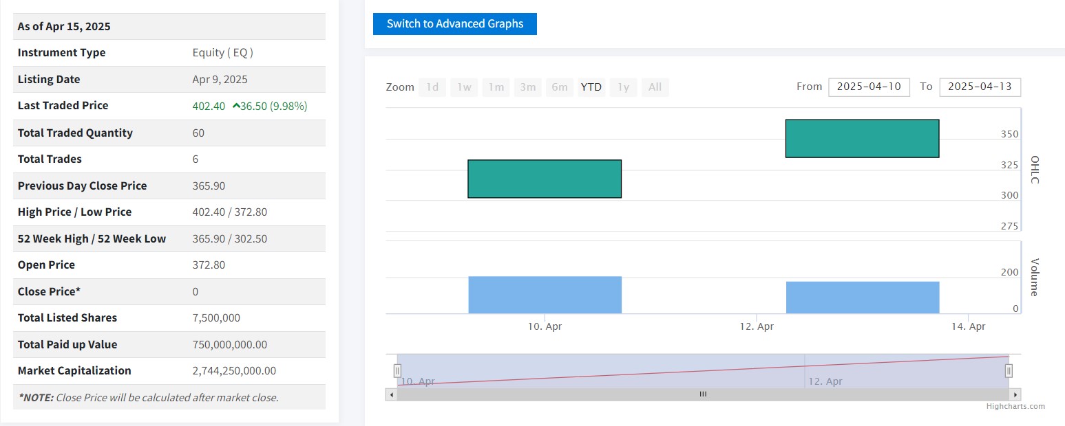 कारोबारमा आएको पहिलो दिन बिहीबार सकारात्मक सर्किट लागेर कम्पनीको १ कित्ता शेयरको मूल्य ३३२ रुपैयाँ ७० पैसा पुगेको थियो।
