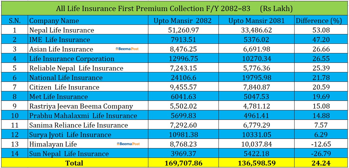 काठमाडौं । जीवन बीमा कम्पनीहरुले चालु आर्थिक वर्षको मंसिर महिनासम्ममा झण्डै १७ अर्ब रुपैयाँको प्रथम बीमा शुल्क आर्जन गरेको छ । नेपाल बीमा प्राधिकरणले आइतबार सार्वजनिक गरेको वित्तीय विवरण अनुसार सञ्चालित १४ जीवन बीमा कम्पनीहरुले पाँच महिनामा उक्त नयाँ व्यवसाय गरेका हुन् । जीवन बीमा कम्पनीहरुको नयाँ बीमा व्यवसा...