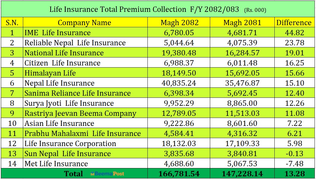 काठमाडौं । नेपालमा सञ्चालित जीवन बीमा कम्पनीहरुले चालु आर्थिक वर्षको माघ महिनामा १६ अर्ब ६७ करोड रुपैयाँ बराबरको कुल बीमा शुल्क आर्जन गरेको छ । नेपाल बीमा प्राधिकरणले सार्वजनिक गरेको तथ्यांक अनुसार सञ्चालित १४ वटा जीवन बीमा कम्पनीहरुले उक्त बीमा शुल्क आर्जन गरेका हुन् । विवरण अनुुसार गत आर्थिक वर्षको तुलनामा जीवन बीमा कम्पनीहरुको बीमा व्यवसाय १३.२८ प्रतिशतले बृद्धि भएको छ । कम्पनीहरुले गत...