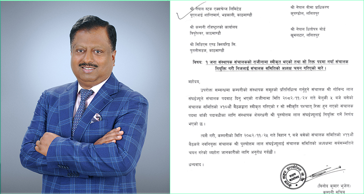 काठमाण्डौ । नेपाल लाइफ इन्स्योरेन्स कम्पनीका अध्यक्ष गोविन्द लाल संघईले राजिनामा दिएका छन् । कम्पनीको फागुन २४ गते बसेको संचालक समितिको बैठकले उनको राजिनामा स्वीकृत गरेको हो । साथै रिक्त हुन गएको संचालक पदमा बाँकी पदावधिका लागि संस्थापक शेयरधनी पुरुषोत्तम लाल संघाईलाई नियुक्त गरिएको छ । कम्पनीको फागुन २५...