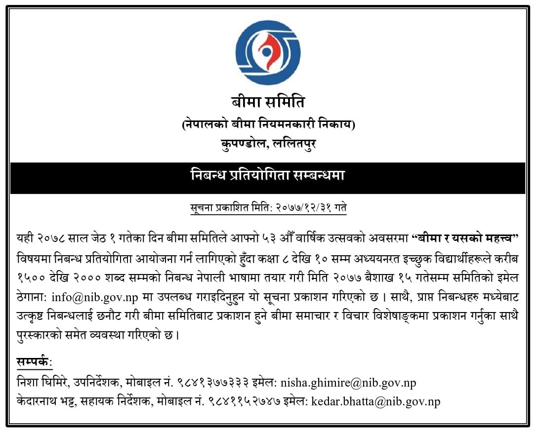 बीमा समितिको ५३ औं बार्षिकोत्सवको अवसरमा ‘बीमा र यसको महत्व’ बिषय निबन्ध प्रतियोगिता आयोजना गरिने आज प्रकाशित सूचनामा जनाइएको छ । सो प्रतियोगितामा नेपालभरका विद्यालयमा अध्ययनरत कक्षा ८ देखि १० सम्मका विद्यार्थीहरुले भाग लिन पाउनेछन् । १५०० शब्ददेखि २००० शब्द सम्मको निबन्धलाई प्रतियोगितामा समावेश गराइने बीमा समितिले जनाएको छ ।