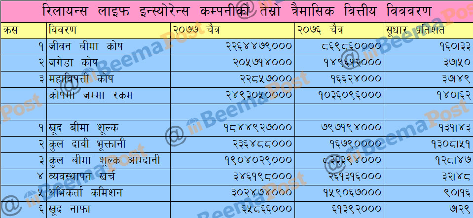 काठमाडौँ । रिलायन्स लाइफ इन्स्योरेन्सले चालु आर्थिक वर्षको तेस्रो त्रैमासिक वित्तीय विवरण आज सार्वजनिक गरेको छ । आज प्रकाशित वित्तीय विवरण अनुसार सो कम्पनीले लकडाउनकै बीचमा उल्लेखनीय प्रगति हासिल गर्न सफल भएको देखिएको छ । नयाँ कम्पनीको रुपमा चार वर्षअघि मात्रै व्यवसाय सुरु गरेको कम्पनीले केही महिना पहिले मात्रै आईपिओ जारी गरी बीमा समितिले तोकेको चुक्ता पुँजि पूरा गर्न सफल भएको थियो ।