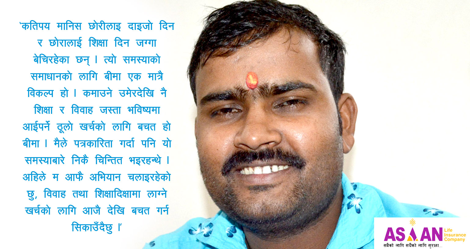 यहाँ धेरै ग्रामिण क्षेत्र भएको गरिब देखी धनाढ्यहरु पनि छन । अहिले पनि तराईमा दाइजो प्रथा कायम नै रहेको छ । कतिपय मानिस छोरीलाइ दाइजो दिन र छोरालाई शिक्षा दिन जग्गा बेचिरहेका छन् । त्यो समस्याको समाधानको लागि बीमा एक मात्रै विकल्प हो । कमाउने उमेरदेखि नै शिक्षा र विवाह जस्ता भविष्यमा आईपर्ने ठूलो खर्चको लागि बचत हो बीमा । मैले पत्रकारिता गर्दा पनि यो समस्याबारे निकै चिन्तित भइरहन्थे । अहिले म आफै अभियान चलाइरहेको छु, विवाह तथा शिक्षादिक्षामा लाग्ने खर्चको लागि आजै देखि बचत गर्न सिकाउँदैछु । यो क्षेत्रमा बीमा गर्नु पर्छ भन्ने चेतना दिनुको अर्थ तराई मधेशका आम समस्याको समाधान निकाल्नु पनि हो । अर्को कुरा दिनभरी मजदुरी गरेर कमाइने पैसा गलत प्रयोग गर्नुभन्दा अलिकति भए पनि बीमामा बचत गर्नुपर्छ भनेर यहाँका बासिन्दालाइ सन्देश दिने सबैको घरदैलोमा जाने काम गरेको हुँ ।