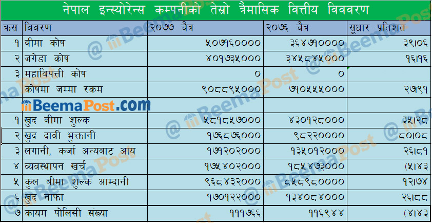 कम्पनीको मुनााफा २६.८८ प्रतिशतले बृद्धि भएको छ । कम्पनीले चालुु आवको नौ महिनामा १७ करोड एक लाख २२ हजार रुपैयाँ मुनाफा आर्जन गरेको छ । अघिल्लो आवमाम जम्मा १३ करोड ४०० लाख ८४ हजार रुपैयाँ मुनाफा गरेको थियो । केही समयदेखि मुनाफा र बीमा व्यवसाय दुवै खस्किदै गएकोमा चालु आवको त्रैमासिक विवरणमा कमब्याक गरेको देखिएको छ ।