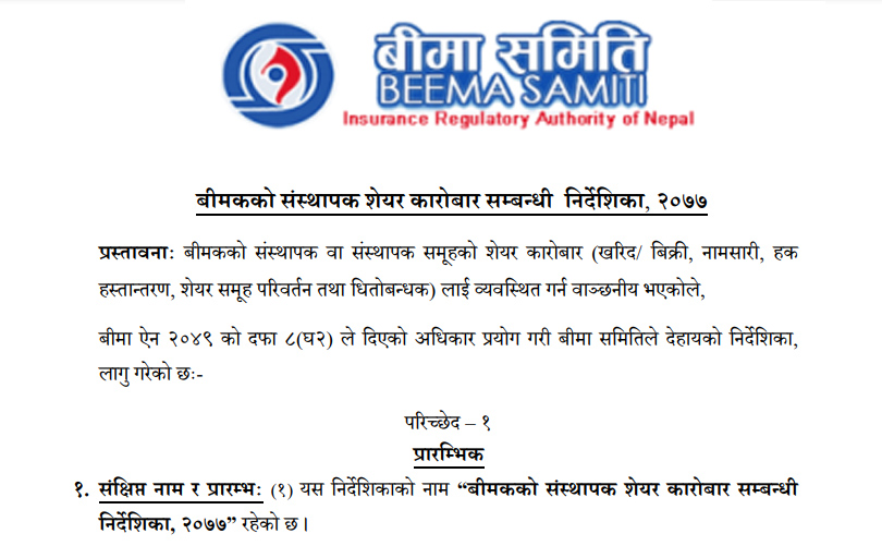 काठमाडौं । बीमा समितिले आज जारी गरेको बीमक कम्पनीको संस्थापक शेयर लगानी सम्बन्धी निर्देशिका बीमा कम्पनीका संस्थापक शेयरधनीहरुलाई निकै अप्ठेरो पार्ने देखिएको छ ।