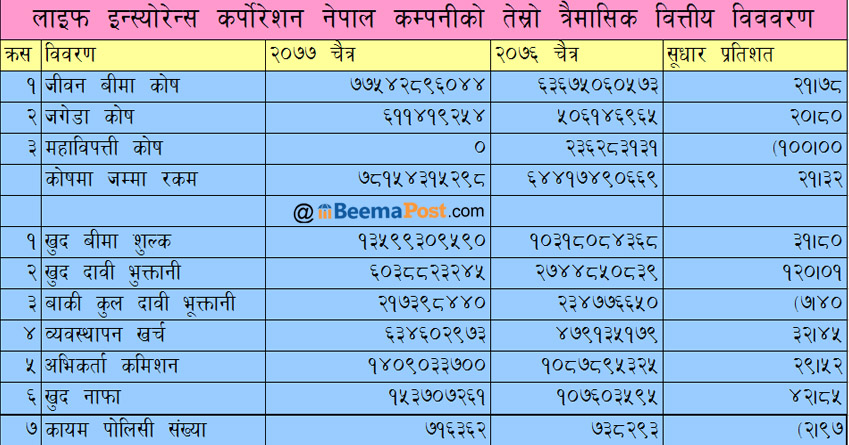 कम्पनीको जगेडा कोष २० प्रतिशतले बृद्धि हुँदा महाविपत्ति कोषबाट रकम झिकेको वित्तीय विवरणमा देखिएको छ । कम्पनीको खुद बीमा शुल्क र खुद मुनाफामा बृद्धि भएपनि हालसम्म कायम बीमा पोलिसी संख्या भने घटेको छ । कोरोना महामारीका कारण कम्पनीको परिपक्व तथा सरेन्डर बीमा पोलिसीले नयाँ जारी बीमा पोलिसीलाई उछिनेको देखिएको छ ।