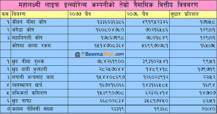 महालक्ष्मी लाइफ इन्स्योरेन्स कम्पनीको व्यवसाय दोब्बर, नाफा ८६%ले बढ्दा जीवन बीमा कोष १७१% ले बृद्धि