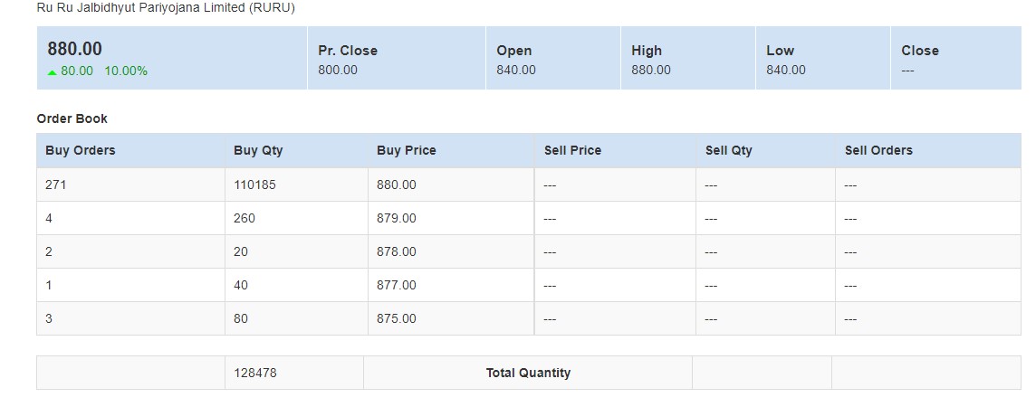 रुरु हाइड्रोपावरको शेयर मूल्यमा लगातार सर्किट, ८८० पुग्यो मूल्य
