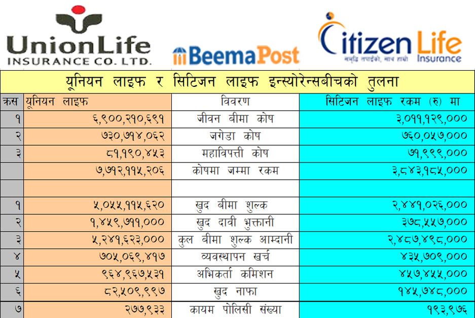 युनियन लाइफ इन्स्योरेन्स कम्पनी सिटिजन लाइफ इन्स्योरेनस कम्पनी भन्दा खुद बीमाशुल्क आर्जनमा अगाडि देखिएको छ ।