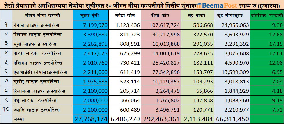 नेप्सेमा सूचिकृत १० जीवन बीमा कम्पनीमा नेपाल लाइफ उत्कृष्ट, कुन कम्पनीको अवस्था कस्तो ? (तथ्याङ्कसहित)