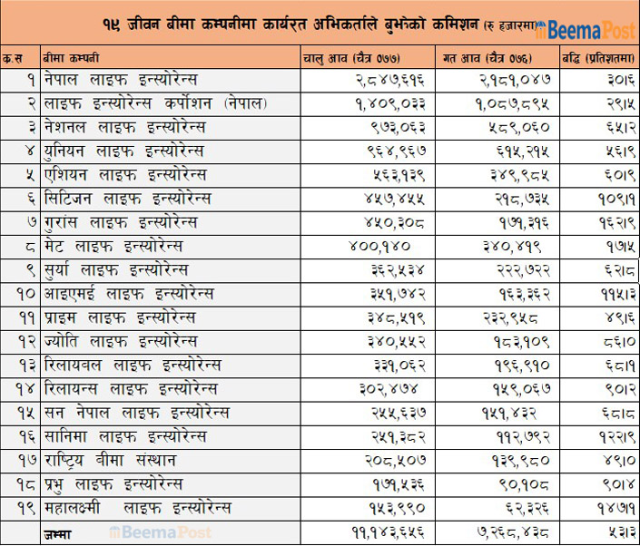 कम्पनीहरुले प्रकाशन गरेको वित्तीय विवरण अनुसार चालु आवको चैत्र मसान्तसम्ममा कूल ११ अर्ब १४ करोड ३६ लाख ५६ हजार रुपैयाँ कमिशन बापत बुझेका हुन् । गत आर्थिक वर्षमा जम्मा सात अर्ब २६ करोड ८४ लाख ३८ हजार रुपैयाँ कमिशन बुझेका अभिकर्ताहरुले यस वर्ष आफ्नो आम्दानी ५३.३ प्रतिशतले बृद्धि गर्न सफल भएका छन् ।