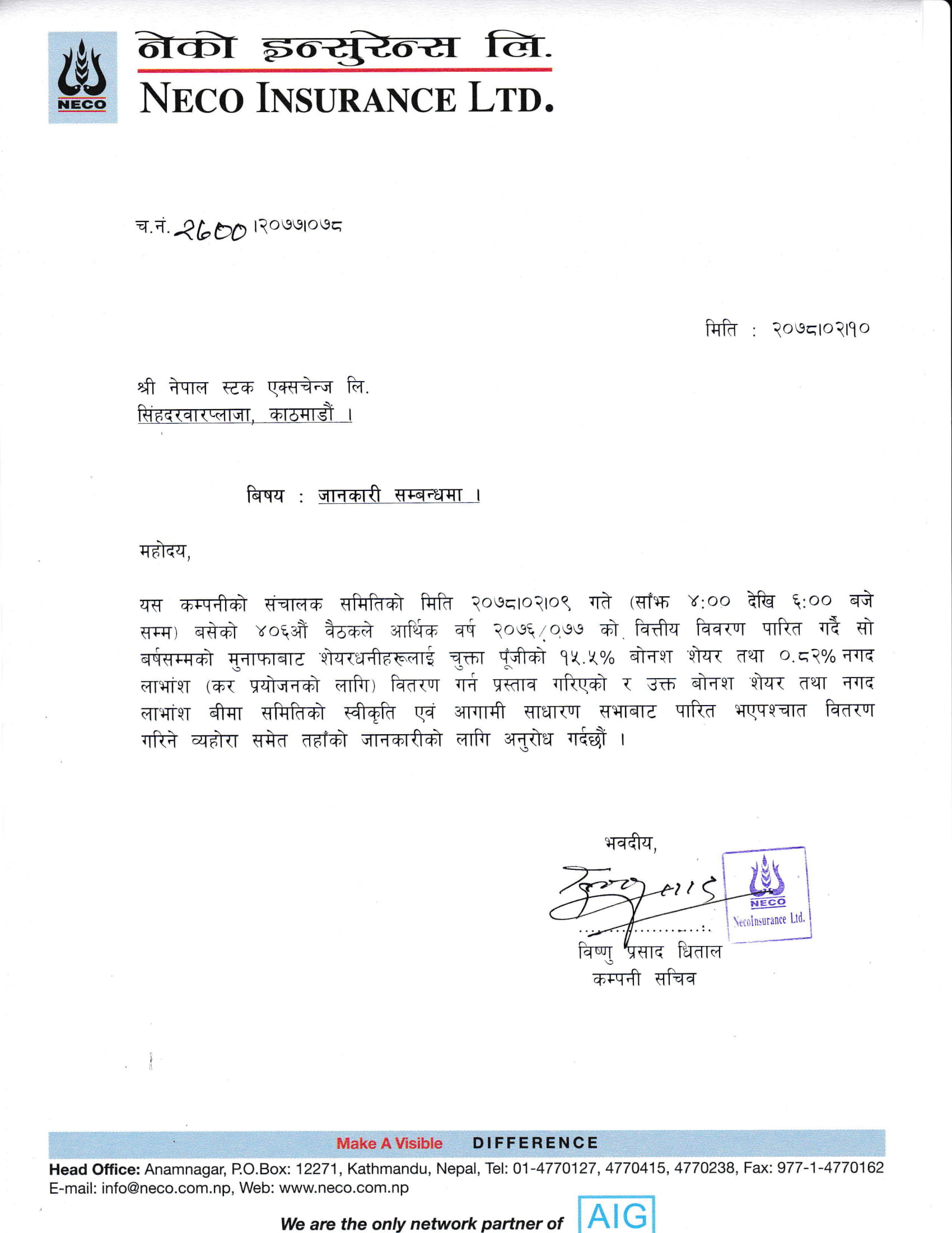 नेको इन्स्योरेन्सले शेयरधनीहरुलाई लाभांश वितरण गर्ने