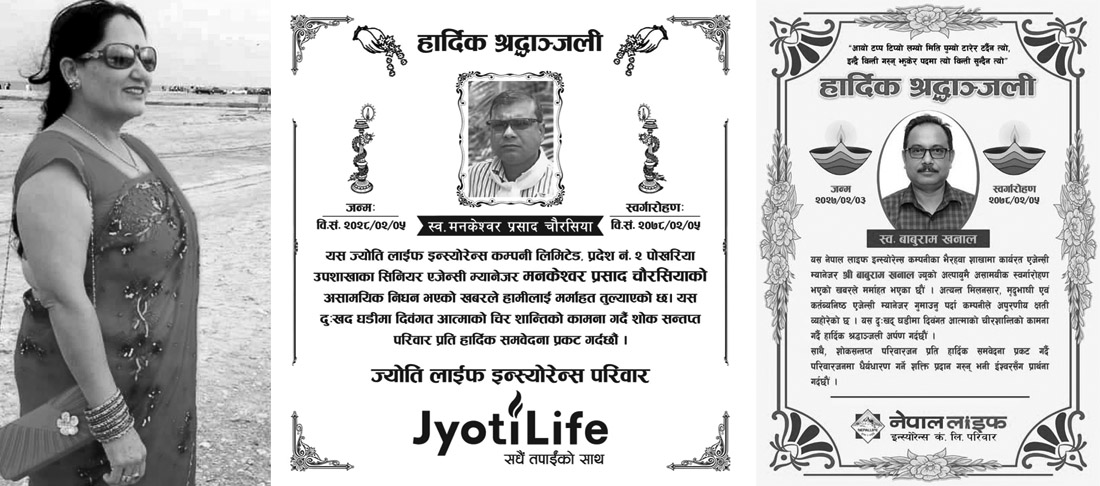 बीमापोष्टले तयार पारेको पछिल्लो रिपोर्टमा ज्योति लाइफ इन्स्योरेन्स कम्पनीको प्रदेश नं २ पोखरिया उपशाखामा कार्यरत एजेन्सी म्यानेजर मन केशर प्रसाद चौरसियाको यही जेठ ५ गते कोरोनाबाट निधन भएको छ । तराई मधेशमा बीमा जनचेतना जगाउने अभियानमा व्यापक रुपमा सक्रिय चौरसिया पेशाले शिक्षक समेत थिए । नेपाल शिक्षक संघ पर्साको कार्य समितिमा रहेर समेत काम गरेको उनले निधनमा पर्साका शिक्षक, विद्यार्थी तथा बीमा अभिकर्ता सहकर्मीहरु मर्माहत बन्न पुगेका छन् ।