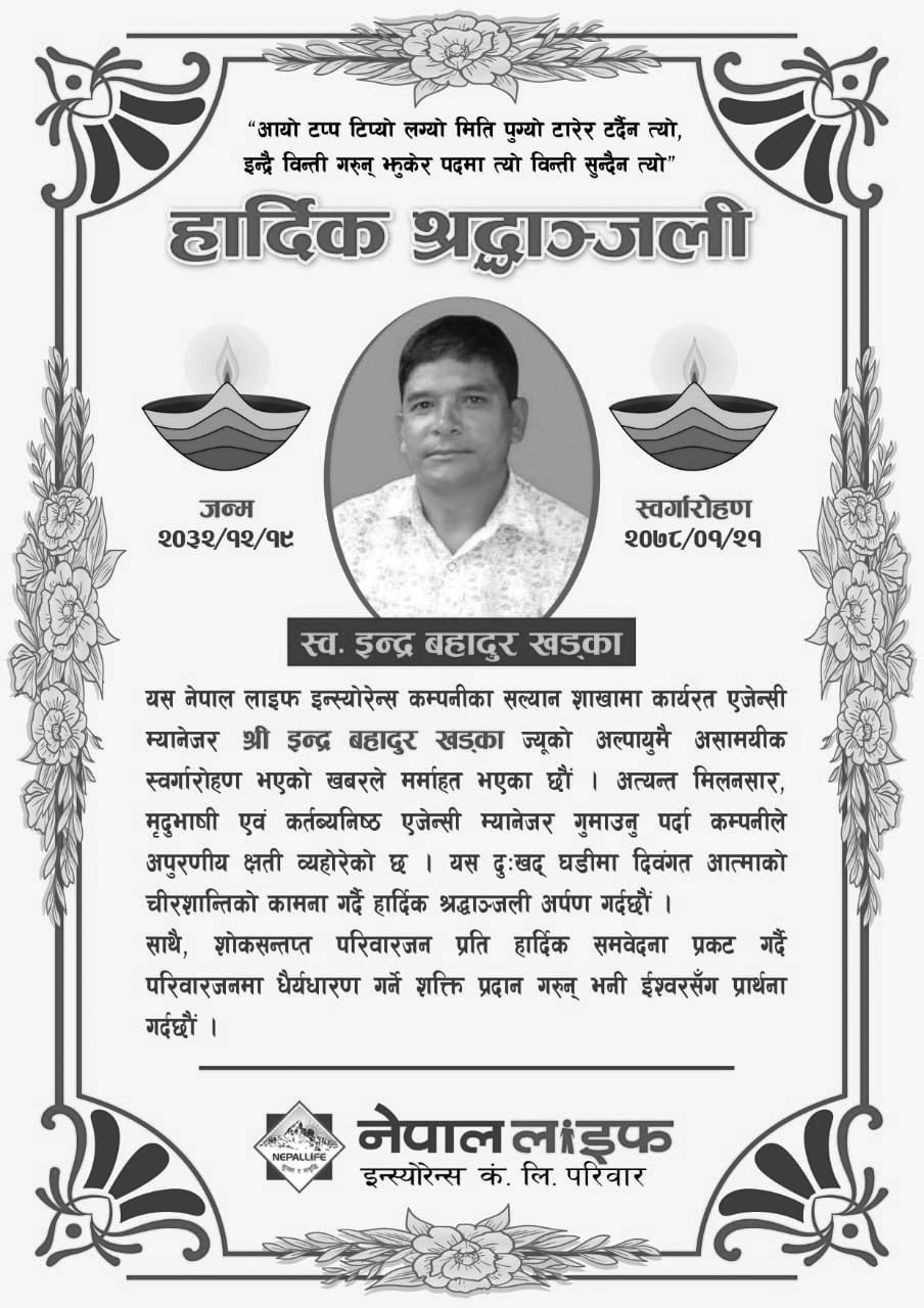 त्यस्तै नेपाल लाइफ इन्स्योरेन्स कम्पनीकै सल्यान शाखामा कार्यरत एजेन्सी म्यानेजर इन्द्र बहादुर खड्काको पनि कोरोना भाइरसको संक्रमणबाट गत बैशाख २१ गते मृत्यु भएको खवर प्राप्त भएको छ ।