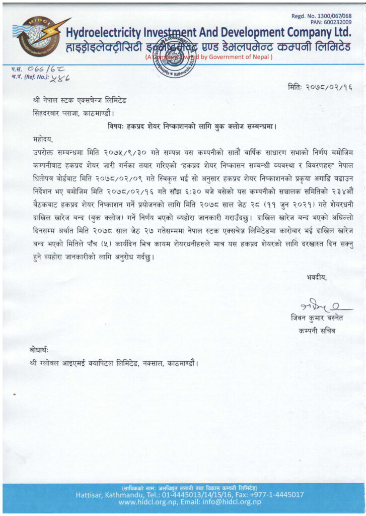 हकप्रद शेयर निष्काशनको लागि एचआईडीसीएलले तोक्यो बुक क्लोज मिति