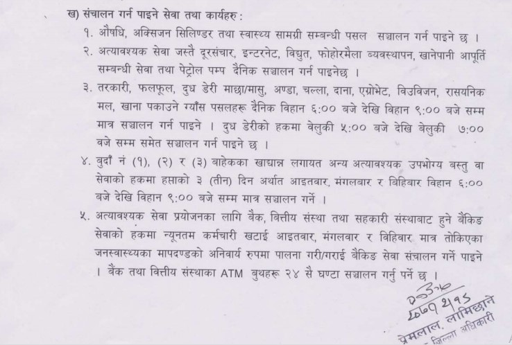 सो अनुसार भोलिबाट बीमा कम्पनीका शाखा कार्यालयहरु सीमित मात्रामा कर्मचारी खटाएर खुल्ला गर्न पाइने भएको छ । त्यस्तै, बैंकका तथा विकाश बैंकका शाखा कार्यालयहरु समेत सीमित कर्मचारीबाट खुल्ला गर्न पाइनेछ । त्यस्तै, सहकारीलाई समेत भोलिबाट खुल्ला गर्न अनुमति दिइएको छ ।