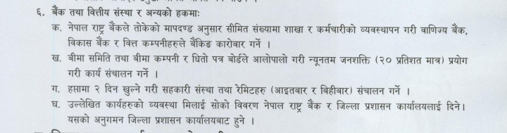 त्यस्तै बैंकहरु पनि सीमित शाखामार्फत बैंकिङ सेवा प्रवाह गर्न काठमाडौं प्रशासनले अनुमति दिएको छ । यसअघि मुख्य शाखा कार्यालय बाहेक चार वटा मात्रै शाखा सञ्चालन गर्न दिँदै आएकोमा अब उक्त दायरामा बृद्धि गरिएको काठमाडौंका प्रमुख जिल्ला अधिकारी काली प्रसाद पराजुलीले जानकारी दिए । अत्यावश्यक सेवा अन्तर्गत रहेको बीमा सेवा बन्द हुँदा सेवाग्राही मारमा परेका थिए ।