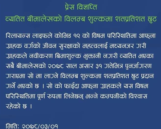 रिलायन्स लाइफको व्यतित बीमालेख नविकरणमा शतप्रतिशत ब्याज छुट