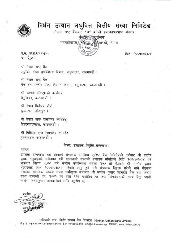 काठमाडौं । निर्धन उत्थान लघुवित्तको संचालकमा एभरेष्ट बैंकको तर्फबाट सन्तोष कुमार भट्टराईलाई नियुक्त भएका छन् । लघुवित्तको असार ४ गते बसेको संचालक समितिको बैठकले सोही दिनदेखि लागू हुने गरी कम्पनीको सञ्चालकमा भट्टराईलाई नियुक्त गरेको हो ।