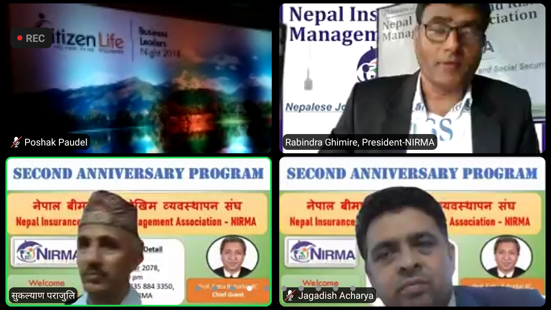 काठमाडौं । नेपाल बीमा तथा जोखिम व्यवस्थापन संघ (निर्मा) को बार्षिकोत्सव सम्पन्न भएको छ । डिजिटल माध्यमबाट जुममार्फत अन्तरक्रिया कार्यक्रमको आयोजना गरी बीमा सम्पन्न भएको छ ।