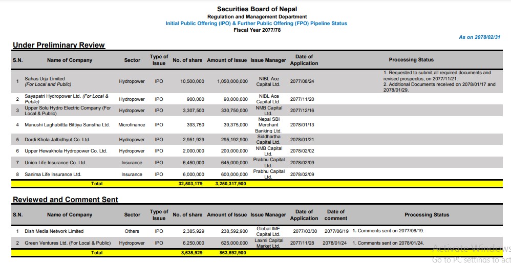 त्यस्तै, आईपिओको लागि बोर्डमा आवेदन दिने कम्पनीहरुमा साहस ऊर्जा (एक करोड पाँच लाख कित्ता), सयपत्री हाइड्रोपावर (९ लाख कित्ता), माथिल्लो सोलु (३३ लाख सात हजार पाँच सय कित्ता), ग्रीन भेन्चर हाइड्रोपावर (६२ लाख ५० हजार कित्ता) र डिस मिडिया नेटवर्क (२३ लाख ८५ हजार ९२९ कित्ता) रहेका छन् ।