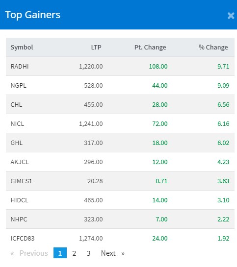 नेप्से ५३ दशमलव ३३ अंकले घट्दा रादी विधुत कम्पनीको ९ दशमलव ७१ प्रतिशत, डाङी गु्रपको ९ दशमलव ९ प्रतिशत, छायाङ्दी हाइड्रोपावरको ६ दशमलव ५६ प्रतिशत, नेपाल इन्स्योरेन्सको ६ दशमलव १६ प्रतिशत, घलेम्दी हाइड्रोको ६ दशमलव २ प्रतिशत र आँखु खोला जलविधुतको ४ दशमलव २३ प्रतिशत अकंले वृद्धी भएको छ ।