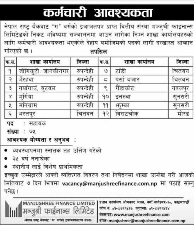 मञ्जुश्री फाईनान्सले माग्यो १२ शाखाका लागि कर्मचारी