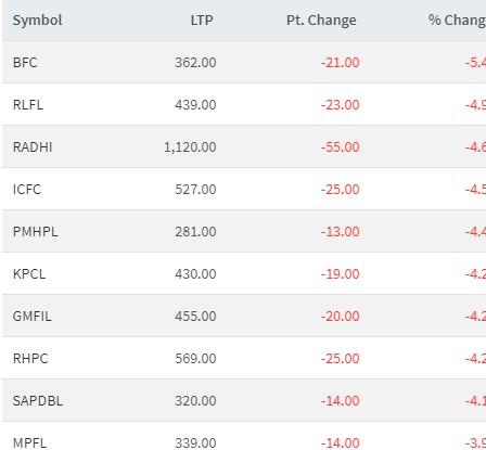 त्यस्तै आज बेष्ट फाइनान्स कम्पनीको ५ दशमलव ४८ प्रतिशत, रिलान्स फाइनान्सको ४ दशमलव ९८ प्रतिशत, रादी विधुत कम्पनीको ४ दशमलव ६८ प्रतिशत, आइसीएफसी फाइनान्सको ४ दशमलव ५३ प्रतिशत, पञ्चकन्या माई हाईड्रोपावरको ४ दशमलव ४२ प्रतिशत र कालिका पावरको ४ दशमलव २३ प्रतिशत अकंले घटेको छ ।