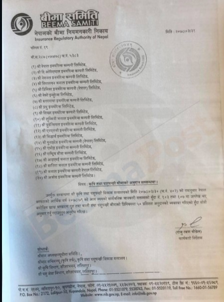 बीमा समितिले आज एक निर्देशिका जारी गर्दै कृषि मन्त्रालयको पत्रअनुसार नेपाल सरकारले चालु आर्थिक बर्षको आय व्ययको सार्वजनिक जानकारी वक्तव्य बुँदा नं १०३ तथा १०७ मा उल्लेख भए बमोजिम खाद्य भण्डार गृह तथा बाली तथा पशुपन्छी बीमाको प्रिमियममा ५० प्रतिशत अनुदानको व्यवस्था गरिएको हुँदा सो अनुसार अनुदान दिन आग्रह गरेको हो ।