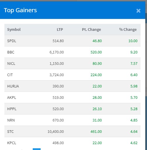 त्यस्तै, बिशाल बजार कम्पनीले ९ दशमलव २० प्रतिशत अकं, नेपाल इन्स्योरेन्स कम्पनीको ७ दशमलव ५७ प्रतिशत अकं, सिटिजन इभेष्टमेन्ट तरुटको ६ दशमलव ४० प्रतिशत अकं र हिमालयन उर्जा विकास कम्पनीले ५ दशमलव ९८ प्रतिशत अकंले वृद्धि भएको छ ।