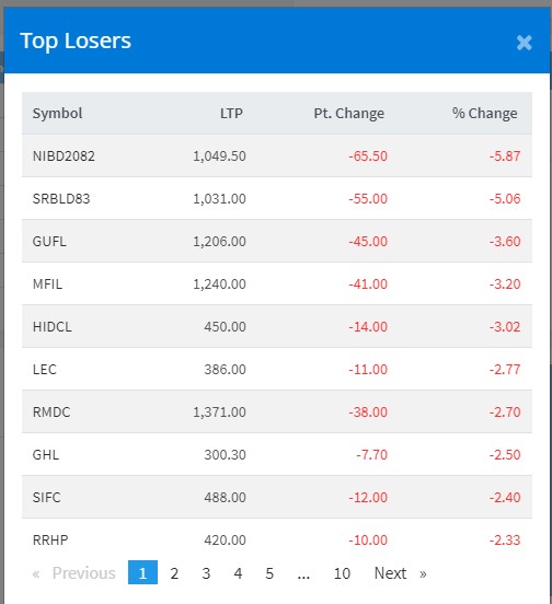 साथै आज सर्वाधिक गुमाउने कम्पनीहरुमा नेपाल इनभेष्टमेन्ट डिबेञ्चरको ५ दशमलव ८७ प्रतिशत अकं, सनराइज बैंक डेबेञ्चरको ५ दशमलव ६ प्रतिशत अकं, गुर्खाज फाइनान्सको ३ दशमलव ६० प्रतिशत अकं र मन्जुश्री फाइनान्सको ३ दशमलव २० प्रतिशत अकंले घटेको छ ।