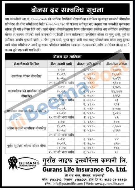 कम्पनीले न्युनतम प्रतिहजार २३ रुपैयाँदेखि ८१ रुपैयाँसम्मको बोनसदर घोषणा गरेको छ ।कम्पनीले निम्न तालिका बमोजिम उ्रल्लेखित बोनस दर मृत्यु दाबी, पूर्ण, आंशिक अवधि भुक्तानी दाबी, समर्पण मूल्य दाबी, चुक्ता मूल्य दाबी तथा चालु आर्थिक बीमालेखमा समेत लागु हुनका साथै बीमा समितिबाट अर्को वर्षको बीमाङकीय मुल्याङकन स्वीकृत नभएसम्मका लागि यस कम्पनीले उक्त बोनसदर निधारण हुने गरि नयाँ बोनसदर घोषणा गरेको हो ।