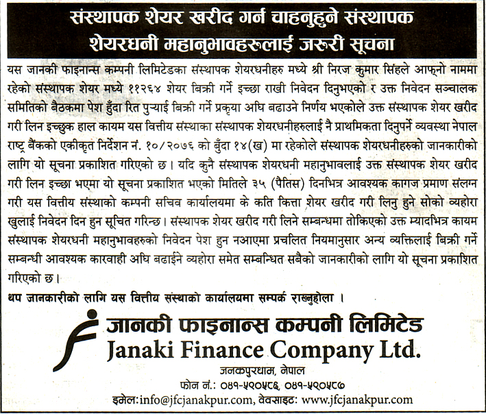 काठमाडौँ । जानकी फाइनान्स कम्पनी लिमिटेडले संस्थापक शेयर बिक्रीमा ल्याएको छ । कम्पनीका संस्थापक शेयरधनी निरज कुमार सिंहले आफ्नो नाममा रहेको ११ हजार २६४ कित्ता संस्थापक शेयर बिक्री गर्न लागेको हो ।