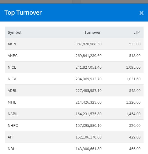 त्यस्तै, अरुण भ्यालि हाइड्रोपावरको २६ करोड ९८ लाख, नेपाल इन्स्योरेन्सको २४ करोड १८ लाख, एनआईसी एशिया बैंकको २३ करोड ४९ लाख र एग्रिकल्चर डेभलपमेन्ट बैंकको २२ करोड ७४ लाख भन्दा माथिको कारोबार भएको छ ।