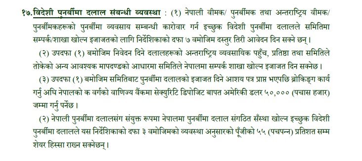 नेपाली कम्पनीले पुनर्बीमा दलालको लाइसेन्स लिँदा उक्त व्यवस्था लागू भएपनि विदेशी कम्पनीको शाखा कार्यालय नेपालमा स्थापना गर्दा भने न्यूनतम रकम लगानीमा खोल्न पाइने भएको छ । पुनर्बीमा दलाल सम्बन्धी निर्देशिका २०७८ को दफा १७ मा विदेशी कम्पनीले नेपालमा पुनर्बीमा व्यवसायको अनुमति लिँदा जम्मा ५० हजार डलर अर्थात आजको मूल्यमा ५९ लाख ५० हजार रुपैयाँ धरौटी राखेपछि अनुमति पाउने व्यवस्था छ ।