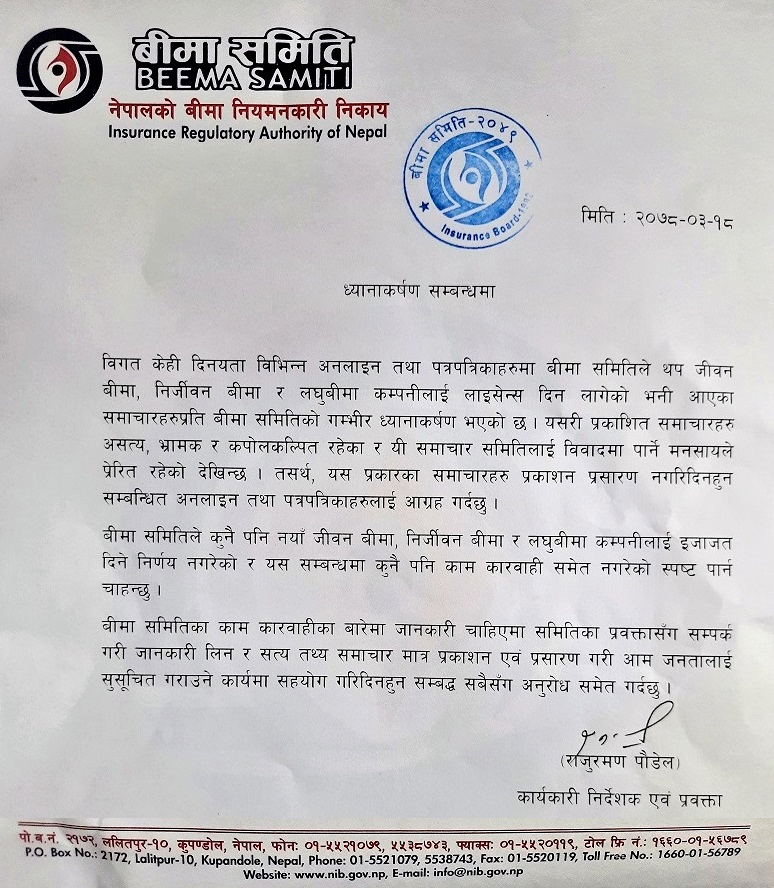 बीमा समितिले बिज्ञप्ति निकालेर भन्यो, ‘नयाँ कम्पनीलाई लाइसेन्स दिन लागेको होइन’