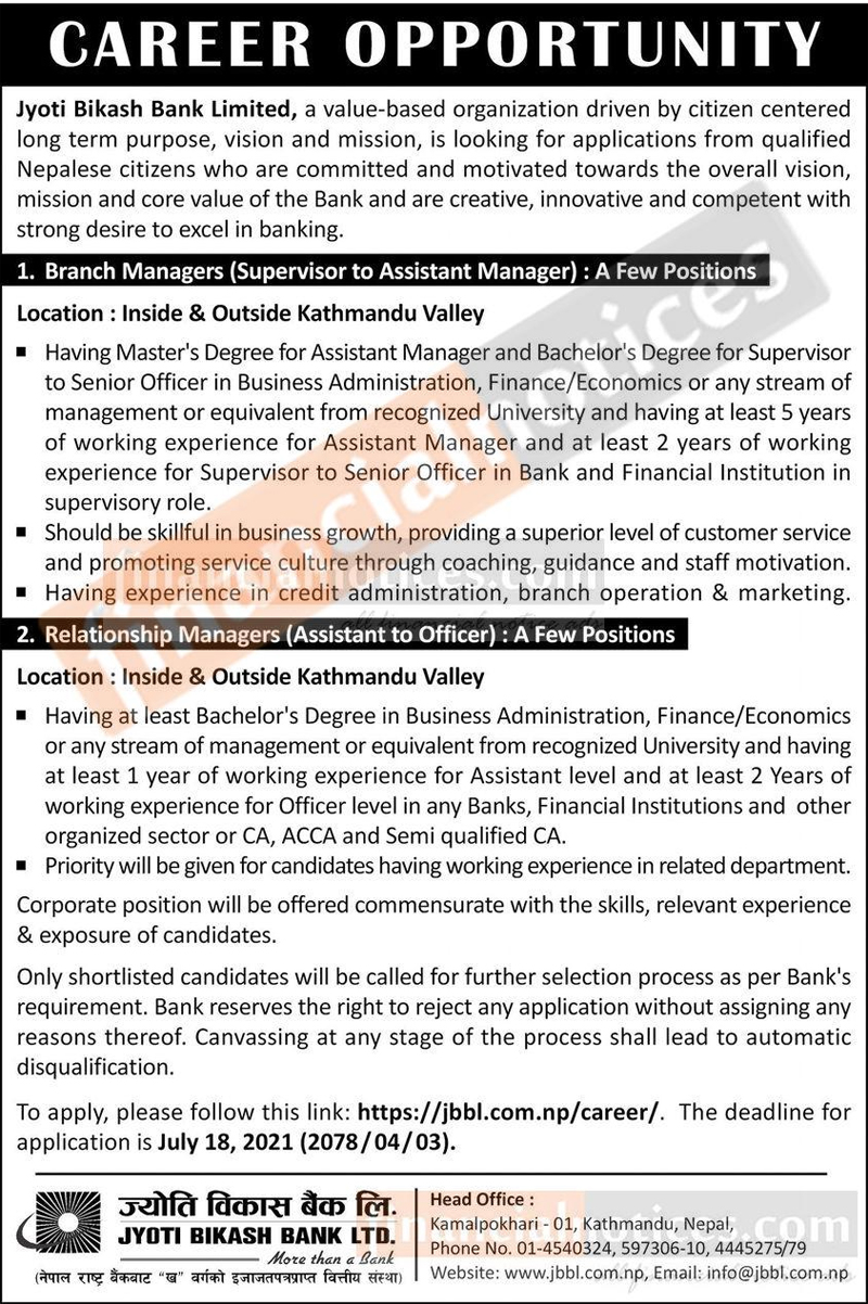 ज्योति विकास बैंकले ब्रान्च म्यानेजर र सहायक म्यानेजर माग्यो