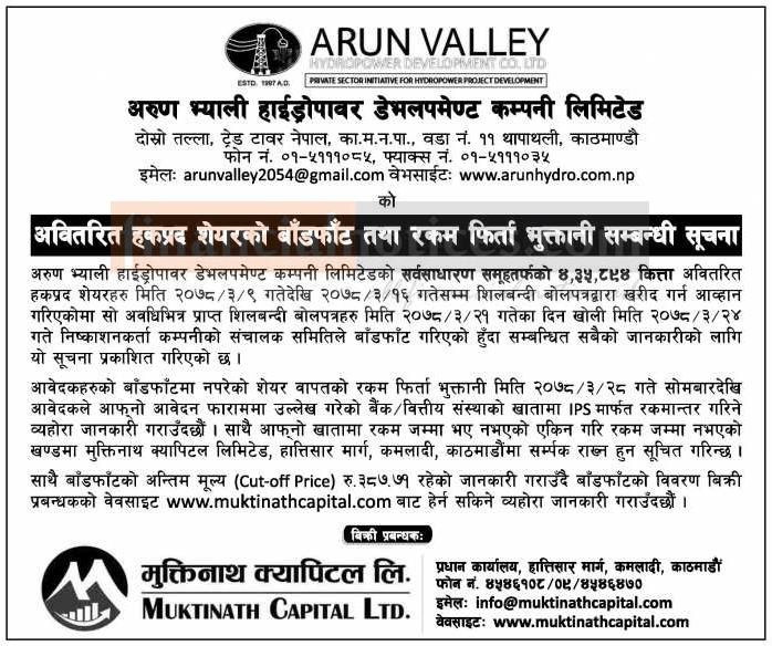 काठमाडौं । अरुण भ्याली हाइड्रोपावर डेभलपमेन्ट कम्पनी लिमिटेडले अवतरित हकप्रद शेयर बाँडफाँड गरेको छ । कम्पनीले सूचना जारी गर्दै बाँडफाँड तथा रकम फिर्ता भुक्तानी गरेको जानकारी गराएको हो ।