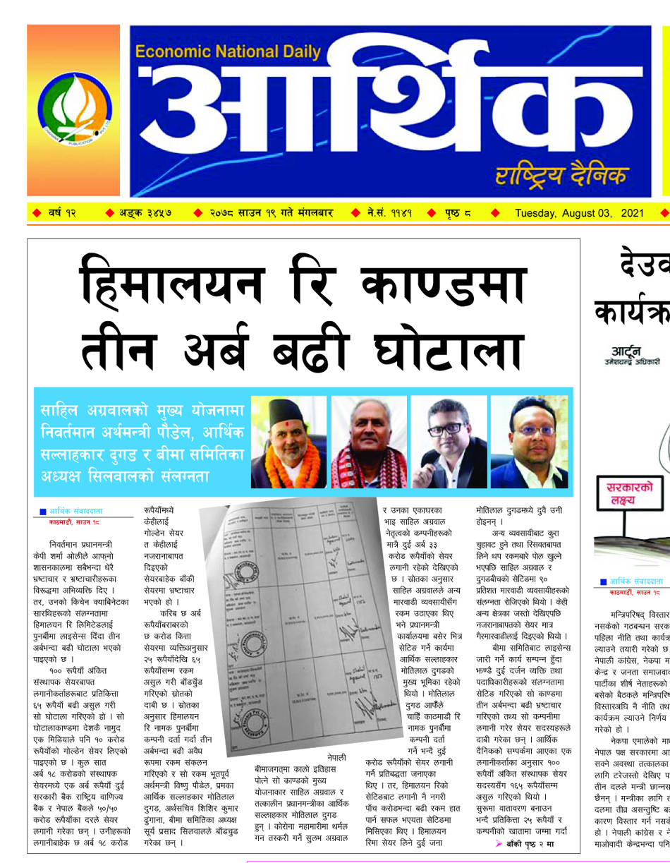 ‘बीमा समितिबाट लाईसेन्स जारी गर्ने कार्य सम्पन्न हुँदा झण्डै दुई दर्जन व्यक्ति तथा पदाधिकारीहरुको संलग्नतामा सेटिङ गरिएको सो काण्डमा तीन अर्बभन्दा बढि भ्रष्टाचार गरिएको तथ्य सो कम्पनीमा लगानी गरेर शेयर सदस्यहरुले दावी गरेका छन्’, भ्रष्टाचार सम्बन्धमा प्रकाशित सनसनीपूर्ण समाचारमा जनाइएको छ ।