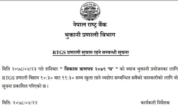 बैंकले “विकास ऋणपत्र २०७९ ’घ’“ को व्याज भुक्तानी प्रयोजनका लागि आरटीजीएस प्रणाली सुचारू रहने सूचना मार्फत जानकारी दिएको हो । भोलि बिहान १०ः३० बजेदेखि ११ः३० बजेसम्म आरटीजीएस प्रणाली खुल्ला रहने राष्ट्र बैंकले जनाएको छ।