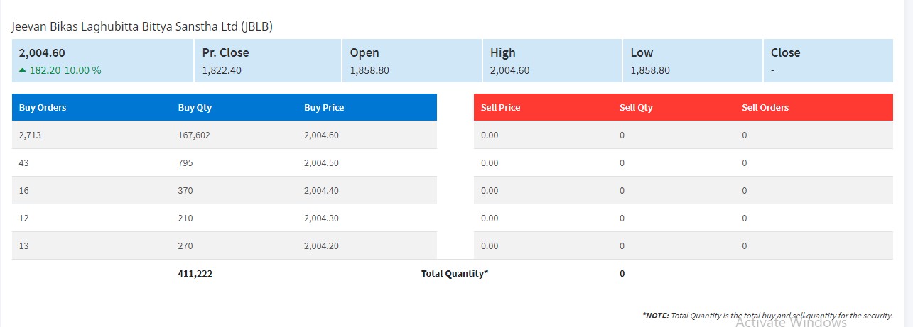 मार्केट डेप्थमा हेर्दा ४ लाख ११ हजार २ सय २२ कित्ता शेयर खरीद माग रहेको छ भने बिक्रिकता शून्य देखिएको छ।