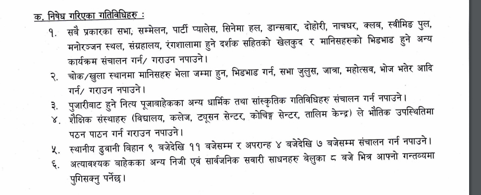 आगामी बिहीबारबाट लागू हुने गरी निषेधाज्ञा थप गर्दै प्रशासनले बेलुकी ८ बजेपछि सार्वजनिक तथा निजी सवारीसाधन सञ्चालनमा रोक लगाइएको काठमाडौं जिल्लाका प्रमुख जिल्ला अधिकारी कालिप्रसाद पराजुलीले जानकारी दिए ।
