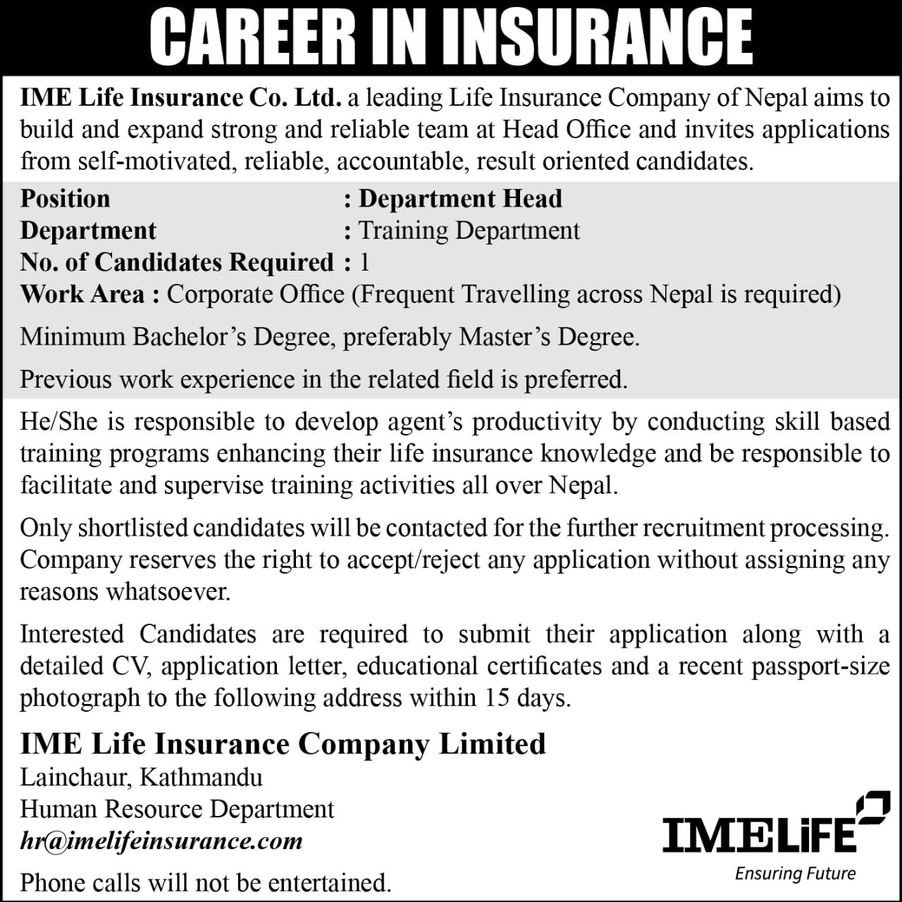 आइएमई लाइफले माग्यो विभागीय प्रमुख