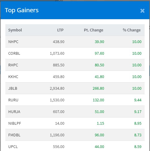 आज नेशनल हाइड्रोपावर कम्पनी, कर्पोरेट डेभलपमेन्ट बैंक, रिडि हाइड्रोपावर डेभलपमेन्ट, खानीखोला हाइड्रोपावर र जीवन विकास लघुवित्तको शेयरमा पोजेटिभ सर्किट लागेको छ । त्यस्तै रु रु जलविद्युुत परियोजनाको ९ दशमलव ४४ प्रतिशत अंकले बृद्धि भई सर्वाधिक कमाउन सफल भएका हुन् ।