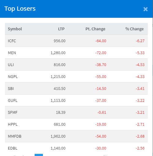 आज गुमाउने कम्पनीहरुमा आईसीएफसी फाइनान्सको ६.२७ प्रतिशत अकं, माउन्टेन इर्नजी नेपालको ५.३३ प्रतिशत अकं, यूनियन लाईफ इन्स्योरेन्सको ४.५३ प्रतिशत अकं, ङादी गु्रप पावरको ४.३३ प्रतिशत अकं र नेपाल एसबिआइ बैंकको ३.४१ प्रतिशत अकंले घटेको हो ।