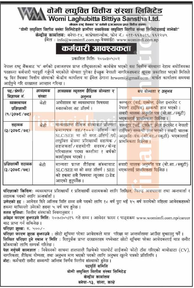 वोमी लघुवित्तमा रोजगारीको अवसर, कति चाहिन्छ शैक्षिक योग्यता ?