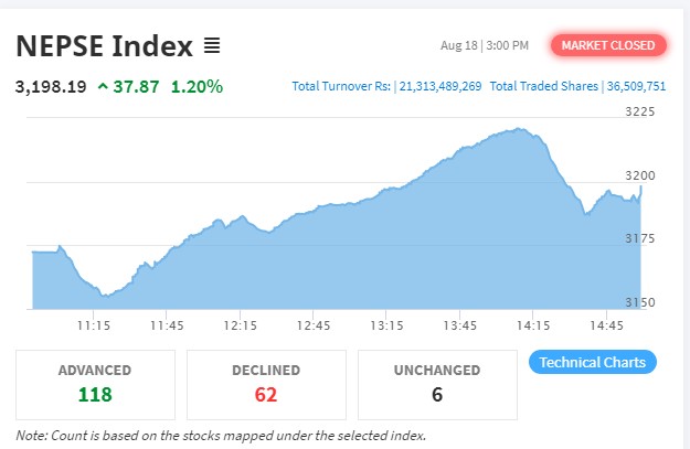 काठमाडौं । बुधबार नेप्से परिसूचक ३७ दशमलव ८७ अंकले बृद्धि भई उच्च विन्दु कायम गर्न सफल भएको छ । पूँजीबजारमा नेप्से परिसूचकमा ३७ अंकको बृद्धि हुुँदा ३१९८ दशमलव १९ विन्दु कायम गरेको छ । नेप्से झण्डै ३२०० को विन्दुमा पुगेर इतिहास कायम गरेको हो ।