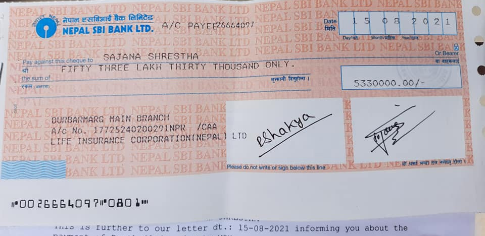 बुधबार धापाखेल निवासी सजना श्रेष्ठ आफ्नै पसल सातदोबाटोमा बसिरहेकी थिईन् । एलआईसी नेपालका दुई जना कर्मचारी पसलमा खोज्दै आईपुगे । उनका श्रीमान कृष्णहरि श्रेष्ठको ११ महिनाअघि ब्रेन ह्यामरेजबाट निधन भएको थियो । दुई वर्ष पहिले एलआईसी नेपालबाट धनबृष्टी बीमा अन्तर्गतको ५० लाख रुपैयाँ बीमाङ्क रकमको पोलिसी खरिद गरेका उनको बीमा गरेको एक वर्षमै निधन भएको थियो । १० वर्षको बीमा गराएका श्रेष्ठको एक वर्षमै ब्रेन ह्यामरेजबाट निधन भएको थियो । मृतककी श्रीमती सजना श्रेष्ठलाई उक्त रकमबराबरकाे चेक ललितपुर शाखा मार्केटिङ प्रमुख घनश्याम बुढाथोकी र एजेन्सी मेनेजर टेक बहादुर खड्काले संयुक्त रुपमा हस्तान्तरण गरेका हुन्।